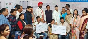 उक्त अवसर पर समाज कल्याण विभाग द्वारा निर्मित स्टाल में मुख्य अतिथि माननीय, श्री कुलदीप सिंग जुनेजा जी, अध्यक्ष, छ.ग. गृह निर्माण, छ.ग. शासन एवं विधायक रायपुर नगर, विशिष्ट अतिथि माननीया श्रीमती शालिनी रिवेन्द्र यादव, अध्यक्ष, जिला पंचायत दुर्ग, माननीय श्री धीरज बाकलीवाल, महापौर, नगर पालिक निगम दुर्ग एव सम्मानीय जनप्रतिनिधिगणों तथा मान. श्री पुष्पेन्द्र कुमार मीणा, जिला कलेक्टर की उपस्थिति में विभागीय योजना दिव्यांग विवाह प्रोत्साहन योजना के तहत निम्न दिव्यांग हितग्राहियों भूपेन्द्र कुमार टोन्डरे, चन्द्रप्रकाश माथुर को एक-एक लाख रूपये एवं योगेश कुमार वर्मा, मनीष कुमार यादव को पचास-पचास हजार रूपये का स्टाल में ही चेक प्रदाय किया गया साथ ही विभागीय अनुदान प्राप्त स्वैच्छिक संस्था स्नेह संपदा विद्यालय के मानसिक दिव्यांग बच्चों के द्वारा निर्मित घरेलू उत्पाद का अवलोकन किया गया।