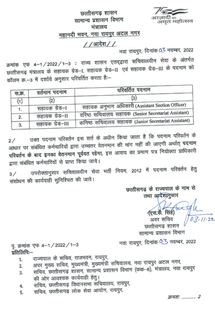 छत्तीसगढ़ शासन के सामान्य प्रशासन विभाग ने आदेश जारी किया है। मंत्रालय के सहायक ग्रेड-1, सहायक ग्रेड-II एवं सहायक ग्रेड-III के पदनाम को परिवर्तित किया गया है। सहायक ग्रेड-1 अब सहायक अनुभाग अधिकारी (Assistant Section Officer) कहलाएंगे। सहायक ग्रेड-II अब वरिष्ठ सचिवालय सहायक (Senior Secretariat Assistant) कहलाएंगे। सहायक ग्रेड-III अब कनिष्ठ सचिवालय सहायक (Junior Secretariat Assistant) कहलाएंगे।