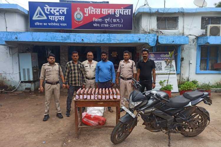 सुपेला थाना प्रभारी दुर्गेश शर्मा ने बताया कि दिनांक 28.06.2023 को मुखबीर द्वारा सूचना मिला कि डेेरा मोहल्ला में एक व्यक्ति अपनी मोटर सायकल से अवैध रूप से शराब लेकर आने वाला है। इसी दौरान मुखबीर द्वारा सूचना मिला की एक व्यक्ति मध्य प्रदेश का शराब अवैध रूप से डेरा मोहल्ला में बिक्री कर रहा है। सूचना मिलते ही सुपेला पुलिस द्वारा तत्काल टीम गठित कर व महिला रक्षा टीम के साथ डेरा मोहल्ला पहुंचकर पुलिस तैनात किया गया। इसी दौरान आरोपी पवन कुमार ध्रुव अपनी मोटर सायकल में दो बोरी में शराब लेकर आ रहा था। जो पुलिस को देखकर हड़बड़ा गया एवं अपनी मोटर सायकल व शराब को नाली में फेक कर भागने लगा। जिसे घेराबंदी कर पकड़ा गया। आरोपी के कब्जे से 138 पौवा गोवा शराब एवं मोटर सायकल सीजी 07 सीएल 0610 को जब्त किया गया। डेरा मोहल्ला सुपेला थाना क्षेत्र का संवेदनशील क्षेत्र है। इस कार्यवाही से डेरा मोहल्ला के अपराधिक किस्म के व्यक्तियों/असामजिक तत्वो पर पुलिस का भय बना है। आरोपी को आज दिनांक 28.06.2023 को गिरफ्तार कर न्यायिक रिमाण्ड में भेजा गया।