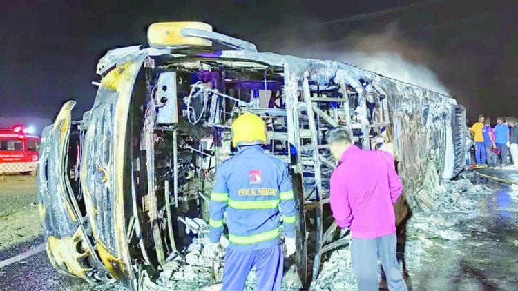 मुंबई, ShorGul.news. महाराष्ट्र के बुलढाना में एक भयंकर हादसा हुआ है. एक बस में आग लगने से 25 लोगों की जिंदा जलकर दर्दनाक मौत हो गई है. ये बस एक शादी के लिए जा रही थी. बारिश के कारण बस फिसल गई. जिसके कारण बस का डीजल टैंक फट गया और आग लग गई. इस हादसे में 25 लोगों की जलने से मौत हो गई. जबकि 8 लोग बुरी तरह से घायल हैं. बताया जा रहा है कि समृद्धि महामार्ग पर अब तक का यह सबसे बड़ा हादसा है. ये सड़क हादसा बुलढाना के देउलगांव खोंड गांव के पास हुआ. इस बस में 30 यात्री सवार थे.