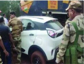 भिलाई। भिलाई स्टील प्लांट के अंदर गुरुवार सुबह मालगाड़ी के लोको इंजन ने सीआईएसफ इंस्पेक्टर की कार को जोरदार टक्कर मार दी। टक्कर इतनी तेज थी कि कार के परखच्चे उड़ गए। ट्रेन के इंजन को अपनी ओर आता देख सीआईएसफ इंस्पेक्टर एसके सिन्हा कार छोड़कर भाग खड़े हुए, नहीं तो उनकी जान जा सकती थी। हादसा जोरातराई गेट से करीब 25 मीटर की दूरी पर हुआ है।